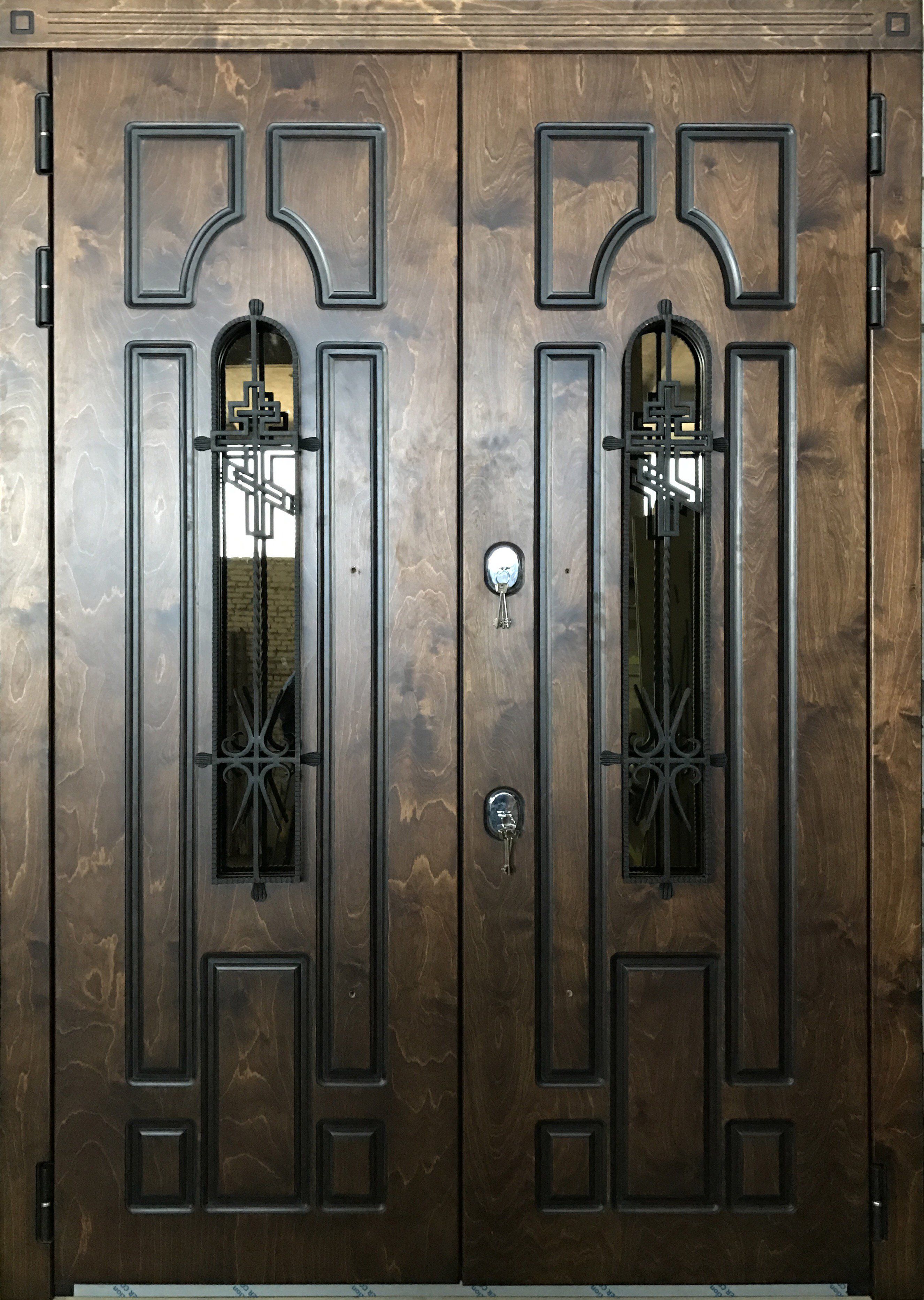 Металлическую дверь из корабельной фанеры можно декорировать ковкой и стеклом, витражом, зеркальными вставками. При установки такой двери в коттедж, стоит рассмотреть вариант изготовления двери с терморазрывом. Это позволит не делать в доме холодный тамбур, но при этом сохранить в доме тепло.
