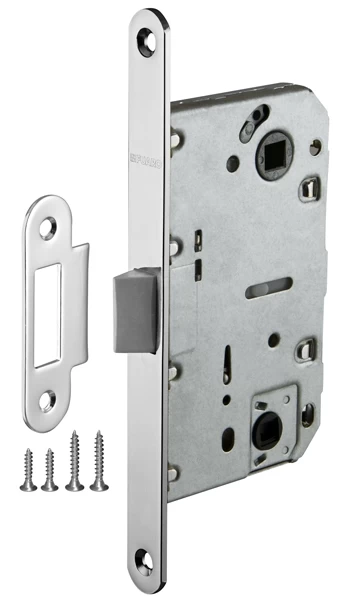 Дверная защелка с пластиковым механизмом Fuaro P96WC серии PLASTIC изготовлена в соответствии с требованиями ГОСТ 5089-2003. Предназначена для установки в деревянные межкомнатные и сантехнические двери. Легкая смена направления язычка защелки, подходит для дверей левого и правого открывания. Корпус выполнен из стали с надежным гальваническим покрытием. Ударопрочный пластиковый механизм обеспечивает бесшумность работы защелки. Защелка P96WC с усиленным блоком пружин имеет высший 4 класс надежности (250 000 циклов открывания/закрывания). Отверстия под стяжные винты находятся на расстоянии 38 мм. Размер бэксета - 50 мм. Размер межосевого расстояния - 96 мм. Возможна установка дверных ручек на стяжные винты для более прочного крепления. Цвет: хром. В комплектацию входят: ответная планка и крепежная фурнитура в цвет изделия.