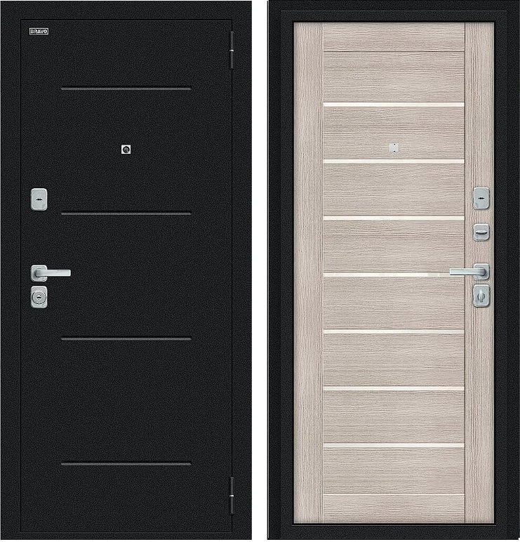 Надежная входная Дверь Браво Техно/BChrome Букле черное/Cappuccino Melinga премиум класса по цене 35 847 руб. Большая толщина стали защитит от проникновения в ваш дом, квартиру или коттедж. Используется очень качественная фурнитура: замки, цилиндры, ручки, защелки. Покрытие и отделка двери изготовлено под внимательным контролем производителя. Дверь имеет долгий срок службы и гарантию.
